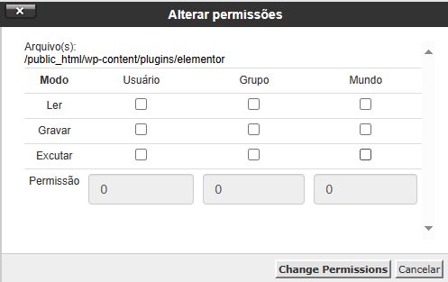 Na telinha que se abrirá, desmarque todas as caixinhas para remover as permissões. O valor padrão da permissão é 755 e, ao desmarcar as caixas, você verá que o número altera.