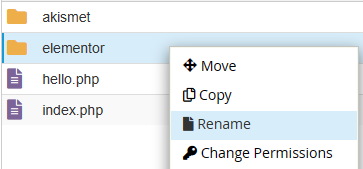 Para facilitar, o comum é adicionar um “.off” no final do nome da pasta, para indicarmos que ele está sendo desativado à força via renomeação. Para renomear a pasta, clicamos sobre ela com o botão direito e, depois, em “renomear” ou “rename”, dependendo do idioma do seu cPanel.