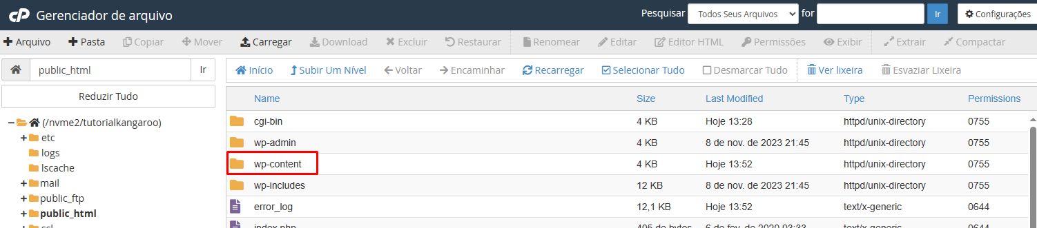 Na nova aba que se abrirá, navegue até o diretório da sua instalação WP. Normalmente, estará no diretório (pasta) public_html. Quando localizar a pasta da instalação, navegue para a pasta wp-content.
