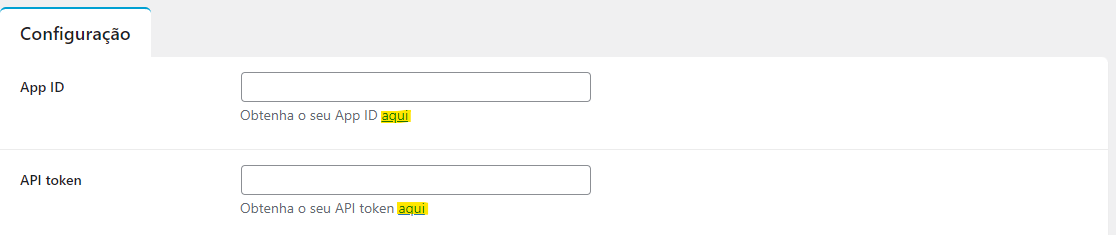 Uma vez dentro da tela do plugin, você terá um formulário no qual deverá preencher as informações de API e Token. Para facilitar, existem dois hiperlinks auxiliares que te levam direto para a área da pushnews onde você pode obter tais informações