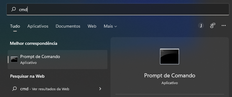 - Em seguida na barra de pesquisa, digite cmd ou prompt de comando e aguarde carregar a tela, por padrão será lhe apresentando o seguinte resultado, basta abrir a opção