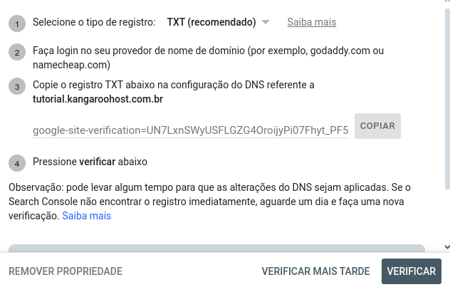 Ou seja, o Google Search espera que o seu domínio tenha uma entrada do tipo TXT com o exato conteúdo que ele gerou aleatoriamente, para confirmar que você é, de fato, dono do domínio.