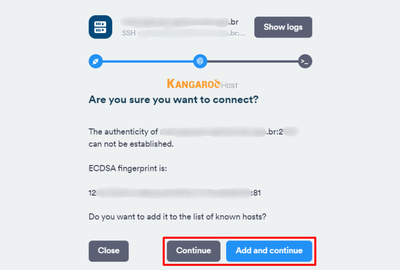 Após clicar em Connect, você deve informar se realmente deseja se conectar ao servidor, e ao clicar em Continue ou Add and continue.