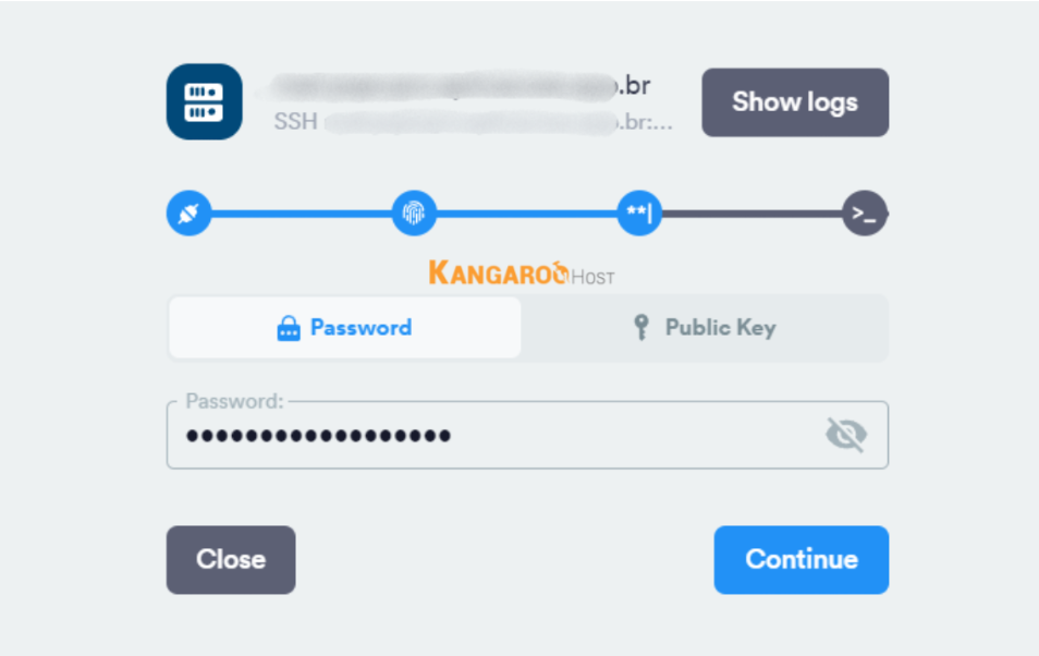 Em seguida, será necessário informar a senha do usuário utilizado para a conexão. Informe a senha e clique em Continue. Feito isso, a sua conexão será realizada e os dados não serão salvos no cliente Termius.