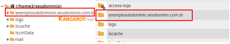 No cPanel subdomínios não tem uma aba separada de domínios comuns, podendo serem vistos juntamente, como no exemplo acima. Além disso, o “Documento Root” é referente ao diretório do site (Domínio ou Subdomínio). Quando abrir o seu gerenciador de arquivos poderá notar que dentro dele já estará criado o diretório pra você com o nome escolhido na hora de criar seu subdomínio: