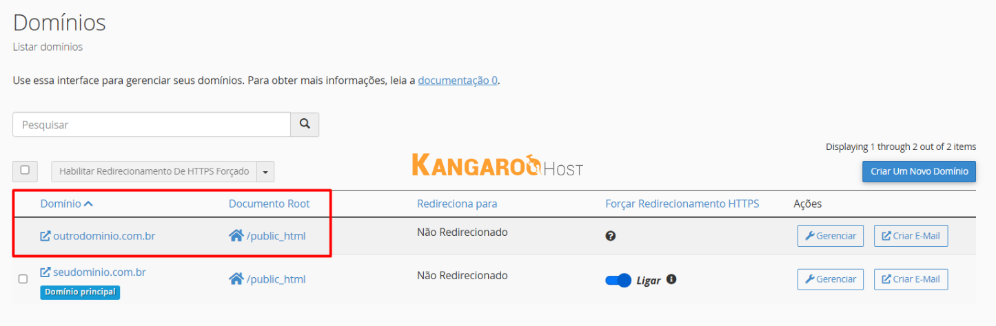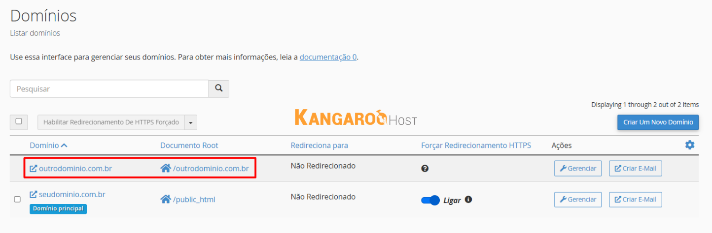 Em outras palavras, o domínio Addon (ou domínio adicional), nada mais é do que um novo domínio cadastrado dentro da sua hospedagem, no mesmo processo apresentado por este artigo, você pode adicionar o domínio e também escolher seu novo diretório. Você deve visualizar algo como: