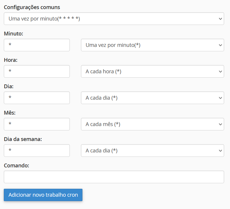 – Para criar um novo Cron Job, você encontrará um formulário onde pode especificar os detalhes do agendamento. No exemplo vamos usar a configuração “Uma vez por minuto”. Dessa forma, a cada minuto, o cron vai executar o comando que será definido no próximo passo. Vale ressaltar que estamos usando “Uma vez por minuto” apenas como exemplo. Você deve definir de acordo com a necessidade do seu comando.