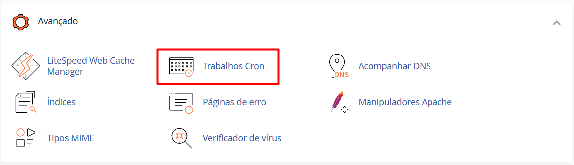 2. Localize a seção “Avançado” e acesse “Trabalhos Cron”. O nome exato pode variar dependendo da versão do cPanel.