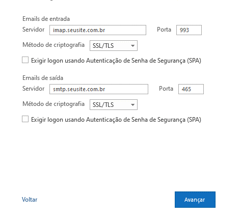 - Servidor de entrada (caso use IMAP): mail.seusite.com.br